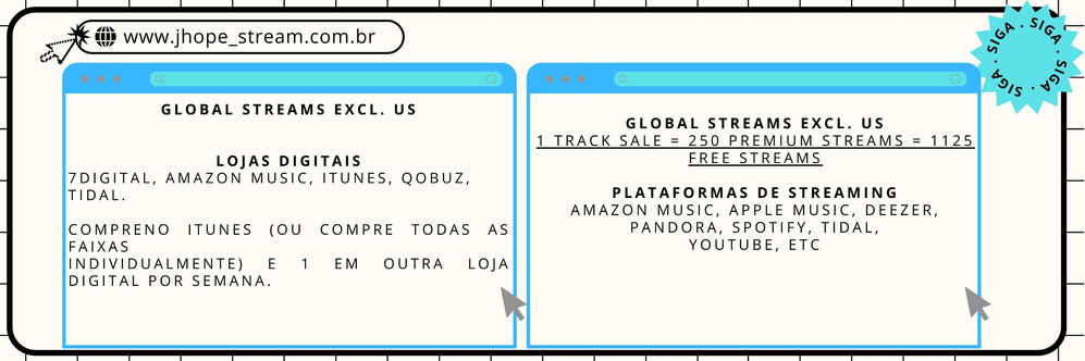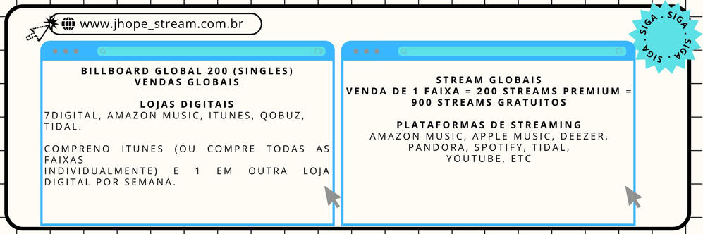 DIRETRIZESEnvolva-se com meios de comunicação e outros tweetsfalando sobre as músicas (curtir, RT, QRT e responder com hashtags).Incluir discussões sobre músicasem todos os tweets. (Ex: “Minha escolha de música popular é…”, “Minha música favorita é…”, “Estou ouvindo…”, “Essa música é mesmo…”, etc).Não envie spam. O gráfico mede oqualidade das postagens e discussões, os spams são considerados postagens de baixa qualidade.Fazer único e diferentetweets: sempre adicione frases e texto, mude o texto sempre que puder e tente adicionar algo novo em cada postagem. (Como fotos, vídeos, gifs ou links para artigos falando sobre as músicas).Compartilhe o link direto para as músicasem seu tweet. Você pode vincular do Youtube e Youtube Music, Spotify, Apple Music ou qualquer outra plataforma de streaming onde as músicas ESTÃO oficialmente disponíveis.Você pode usar tweets pré-fabricadosfornecidos pelas fanbases para economizar tempo, tudo o que você precisa fazer é clicar nos links que compartilharemos e depoispersonalize-o adicionando seu próprio texto exclusivo!