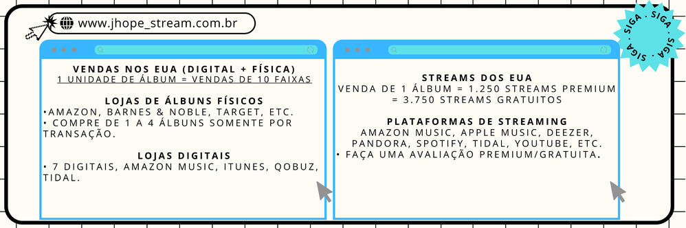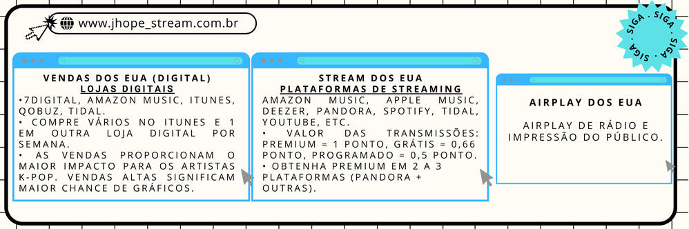 DIRETRIZESEnvolva-se com meios de comunicação e outros tweetsfalando sobre as músicas (curtir, RT, QRT e responder com hashtags).Incluir discussões sobre músicasem todos os tweets. (Ex: “Minha escolha de música popular é…”, “Minha música favorita é…”, “Estou ouvindo…”, “Essa música é mesmo…”, etc).Não envie spam. O gráfico mede oqualidade das postagens e discussões, os spams são considerados postagens de baixa qualidade.Fazer único e diferentetweets: sempre adicione frases e texto, mude o texto sempre que puder e tente adicionar algo novo em cada postagem. (Como fotos, vídeos, gifs ou links para artigos falando sobre as músicas).Compartilhe o link direto para as músicasem seu tweet. Você pode vincular do Youtube e Youtube Music, Spotify, Apple Music ou qualquer outra plataforma de streaming onde as músicas ESTÃO oficialmente disponíveis.Você pode usar tweets pré-fabricadosfornecidos pelas fanbases para economizar tempo, tudo o que você precisa fazer é clicar nos links que compartilharemos e depoispersonalize-o adicionando seu próprio texto exclusivo!